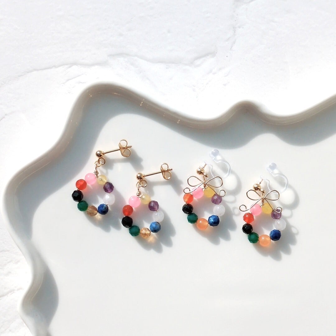 9色の天然石を使用し、カラフルなカラーリングは顔周りを華やかにしてくれます。