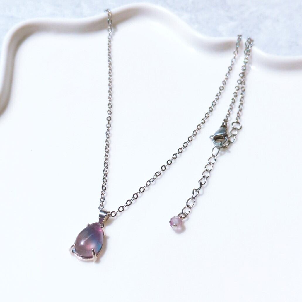 多彩な色合いが美しいマルチカラーフローライトを使用した一連ネックレスは、着用するだけで上品な印象を与えます。ペアシェイプカットのペンダントは、視線を引きつけるデザインで、カジュアルからフォーマルまで幅広いシーンにマッチします。