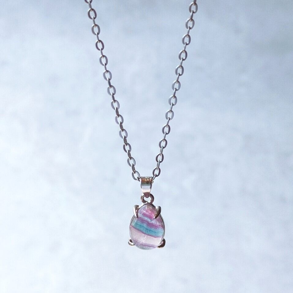 透明感があり、粒ごとに異なる色合いや模様が美しい、マルチカラーフローライトのペアシェイプカボションのペンダントです。