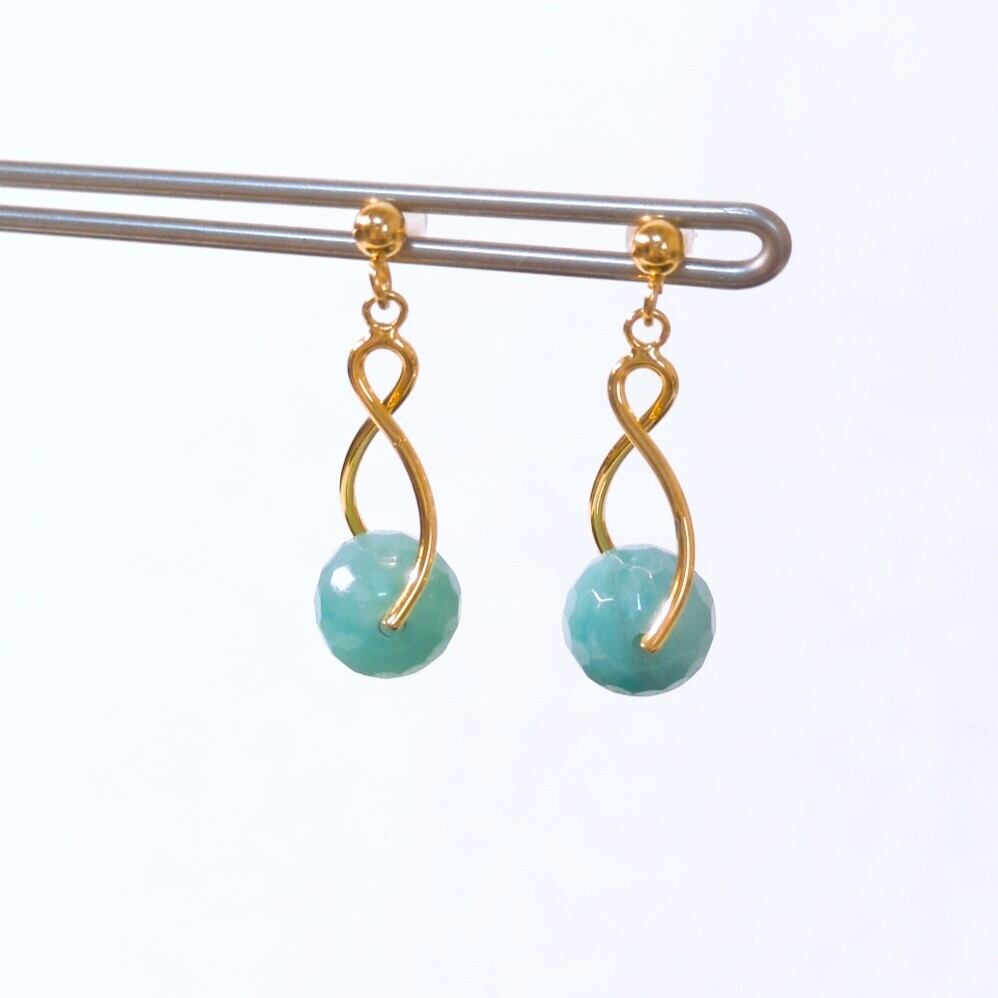 青緑色が美しいアマゾナイトのラウンドカットを片耳に一粒ずつ使用し、洗練されたツイストチャームと組み合わせることで、耳元にさりげない華やかさを演出します。