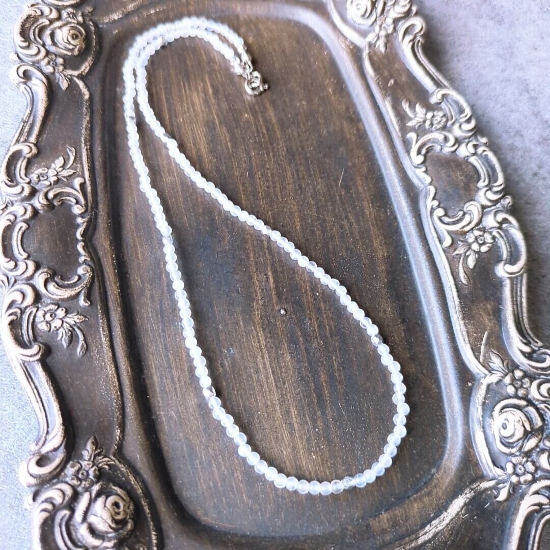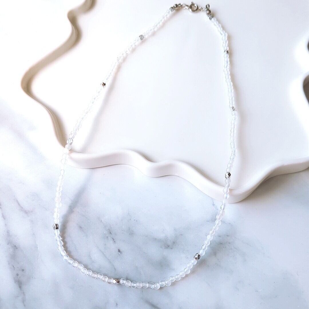 透明感あふれるレインボームーンストーンの3mmラウンドと、シルバーカラーのチェコビーズを等間隔に配置した大人可愛いデザインのネックレスです。