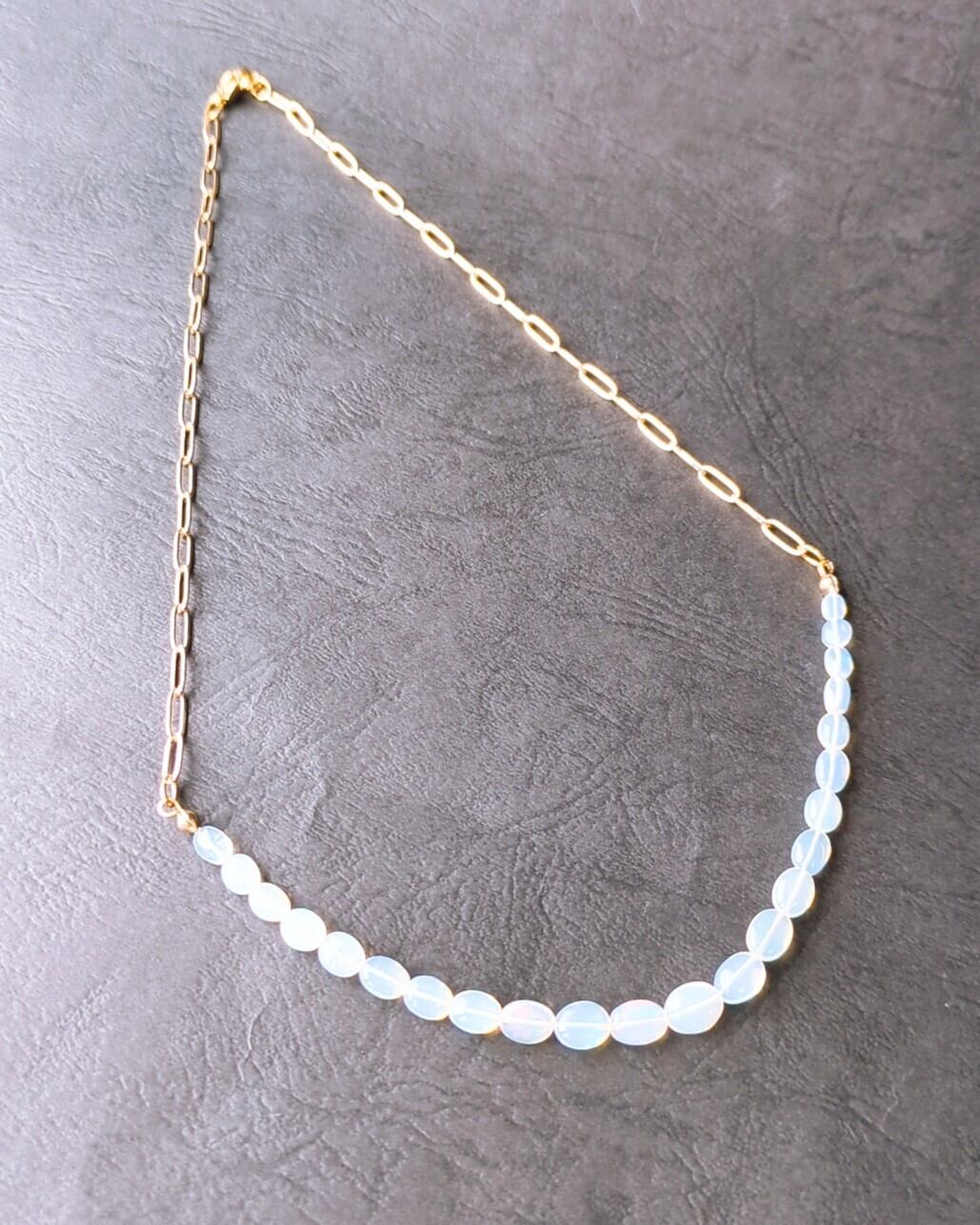 透明感のあるベースに、独特の輝きが魅力的なエチオピア産オパールを使用し、サイドはシンプルで洗練されたステンレスチェーンで繋げました。