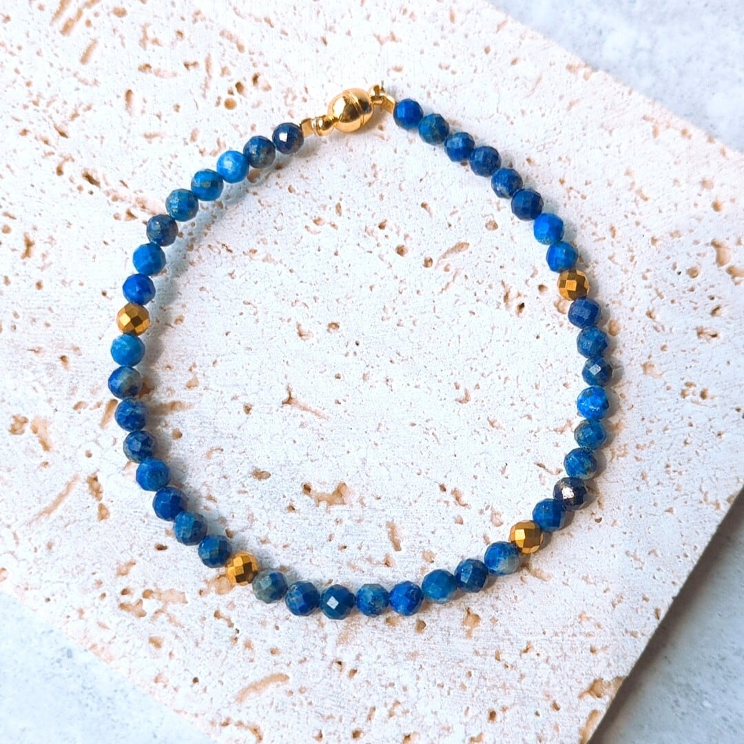 神秘的な輝きを持つ天然石ラピスラズリと、魅惑的なゴールド コーティングのヘマタイトを組み合わせた、贅沢なブレスレットです。鮮やかなネイビーブルーに金色や白のインクルージョンが混ざり合い、まるで夜空に輝く星のような美しさを演出します。