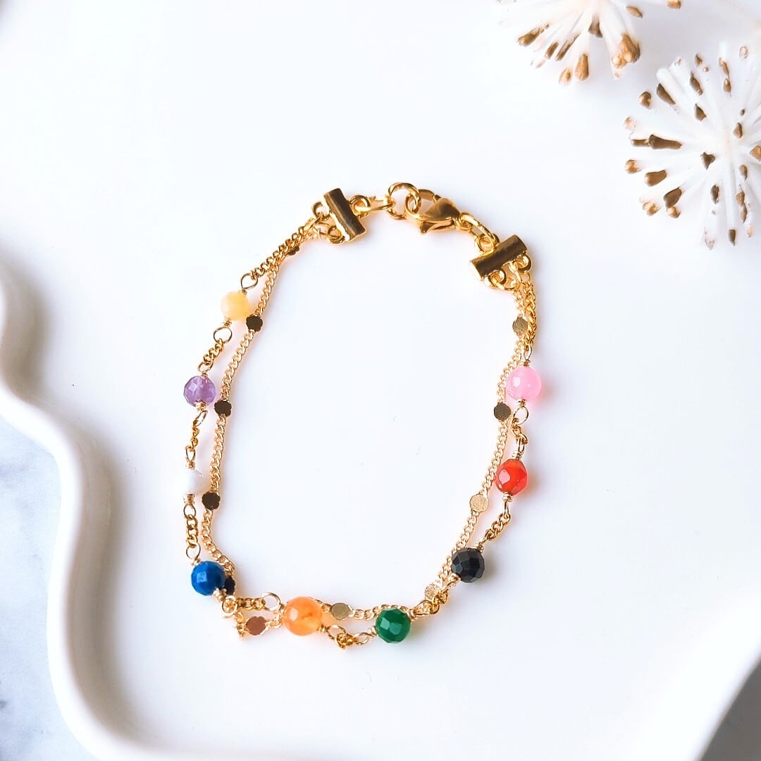 華やかな天然石9色で仕立てられたSnowManカラーの2連ブレスレットです。デザインチェーンとの組み合わせにより、個性的でありながらも上品な印象を与えます。