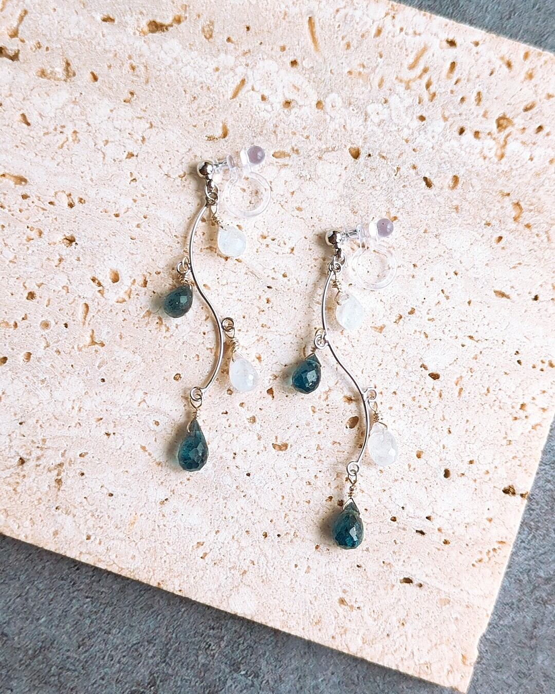 深みのあるインディゴブルーカイヤナイトと幻想的なブルームーンストーンのブリオレットカットを使用した、上品で美しい耳飾りです。ウェーブデザインのパーツに繋げられた石たちが、耳元で優雅に揺れ動き、魅力的な輝きを放ちます。