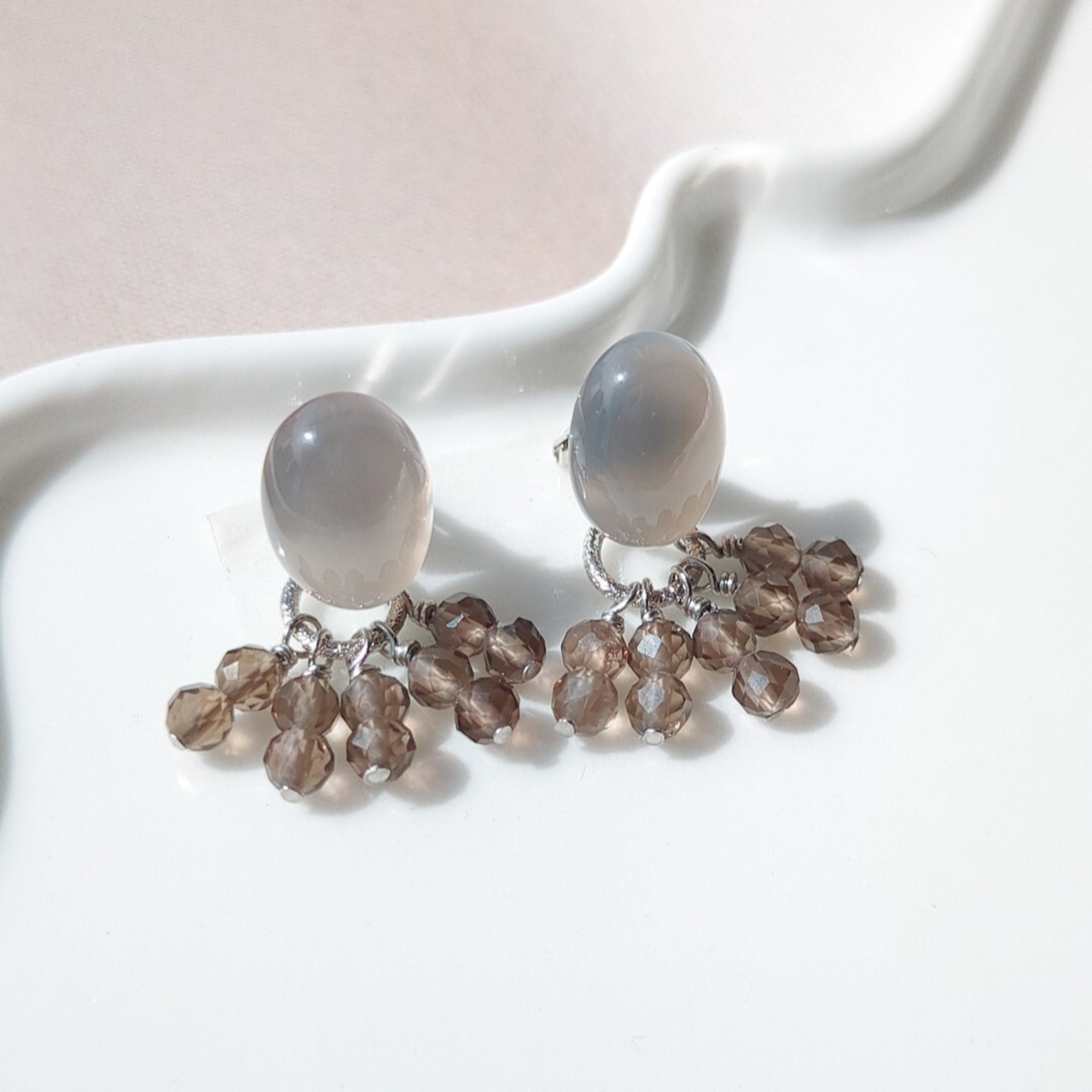 上品なグレーオニキスのオーバルカボションと、スモーキークォーツを組み合わせた耳飾りは、秋冬シーズンにぴったりの落ち着いたカラーリングが魅力的です!
