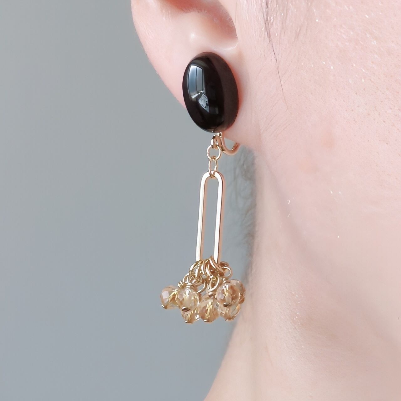 美しいブラックオニキスのオーバルカボションと、ゴールドメタルリングに繋がるファントムシトリンが魅惑的な耳飾りです!揺れるデザインが洗練された印象を演出し、どんなシーンにも華やかさをプラスします。