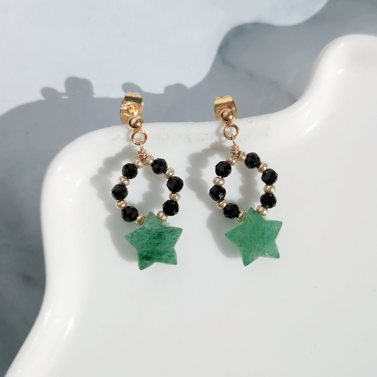 個性的なグリーンアベンチュリンの星型カットが、ブラックスピネルとゴールドビーズとの絶妙なコントラストを生み出す耳飾りです!