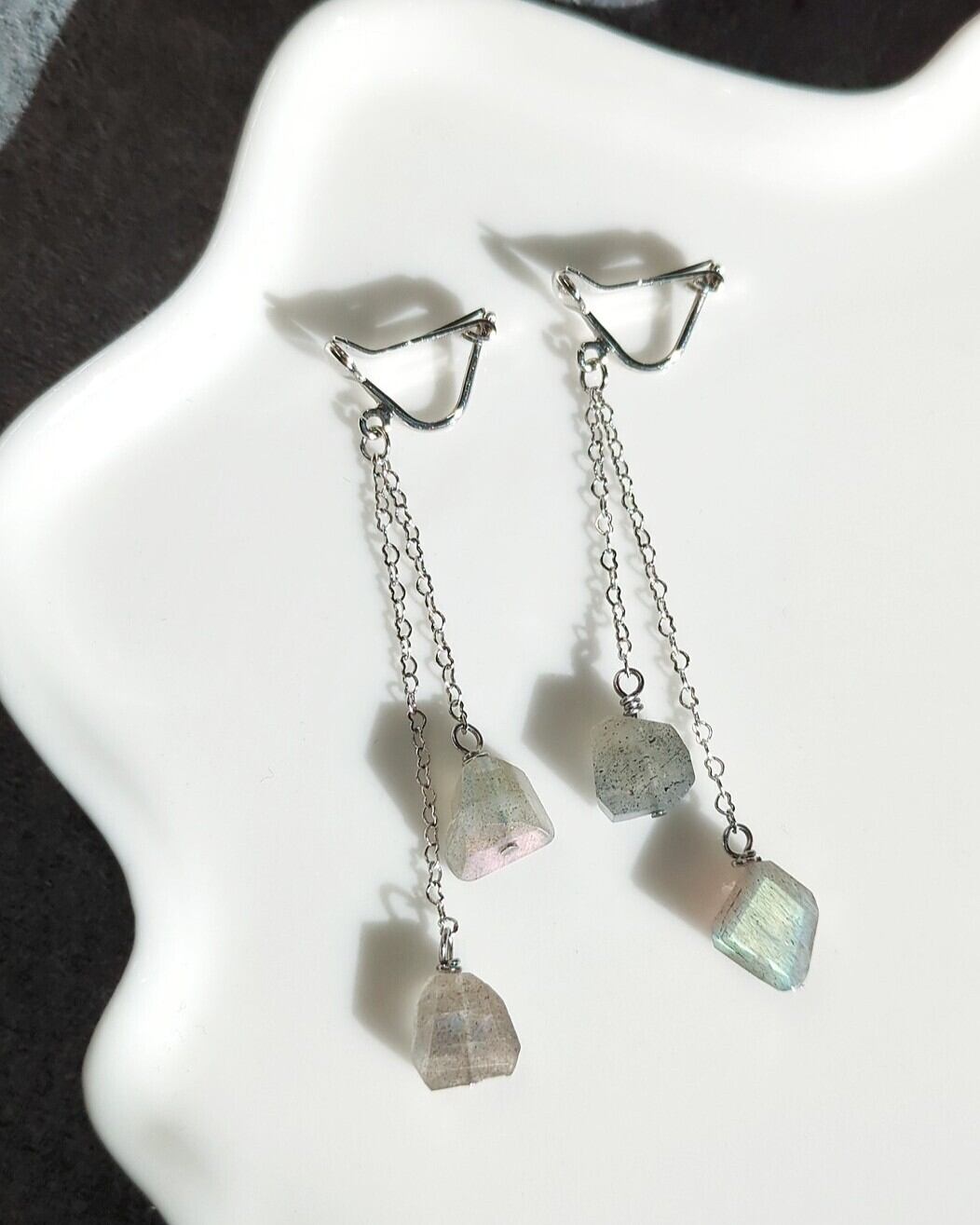 このイヤーアクセサリーは、動くたびにラブラドライトが奏でる光のハーモニーが、あなたの存在感を引き立て、見る人の視線を惹きつけることでしょう。デイリースタイルのアクセントとして、またギフトとしてもおすすめです。