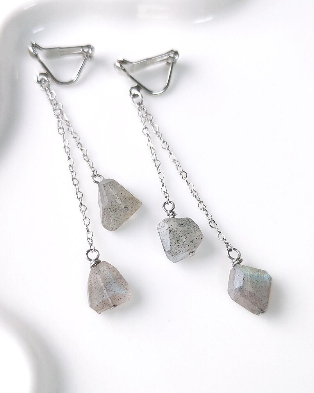 美しいオーロラのような輝きを放つ天然石"ラブラドライト"のタンブルカットを二粒ずつ贅沢に使用したイヤーアクセサリーです。
