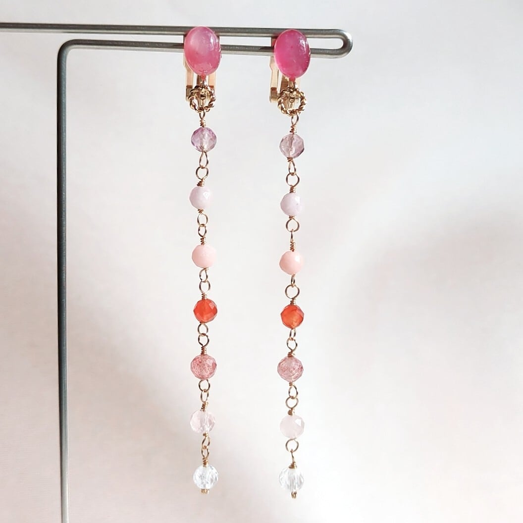 【一点もの】スタールビー オーバル カボション×ピンク系天然石のカラーグラデーション Ⅰライン イヤリングorピアス
