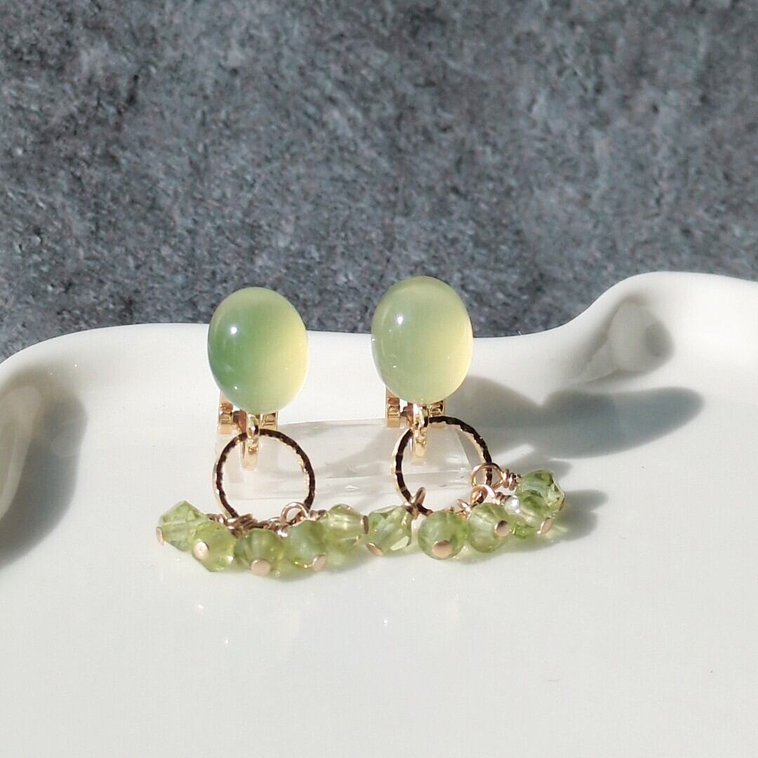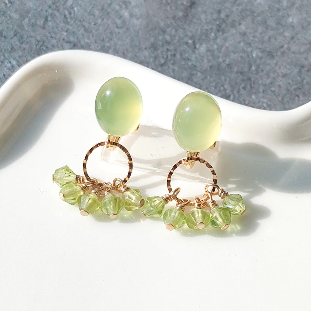 ライムグリーンカルセドニー オーバルカボション×ペリドット ソロバンカット イヤリングorピアス