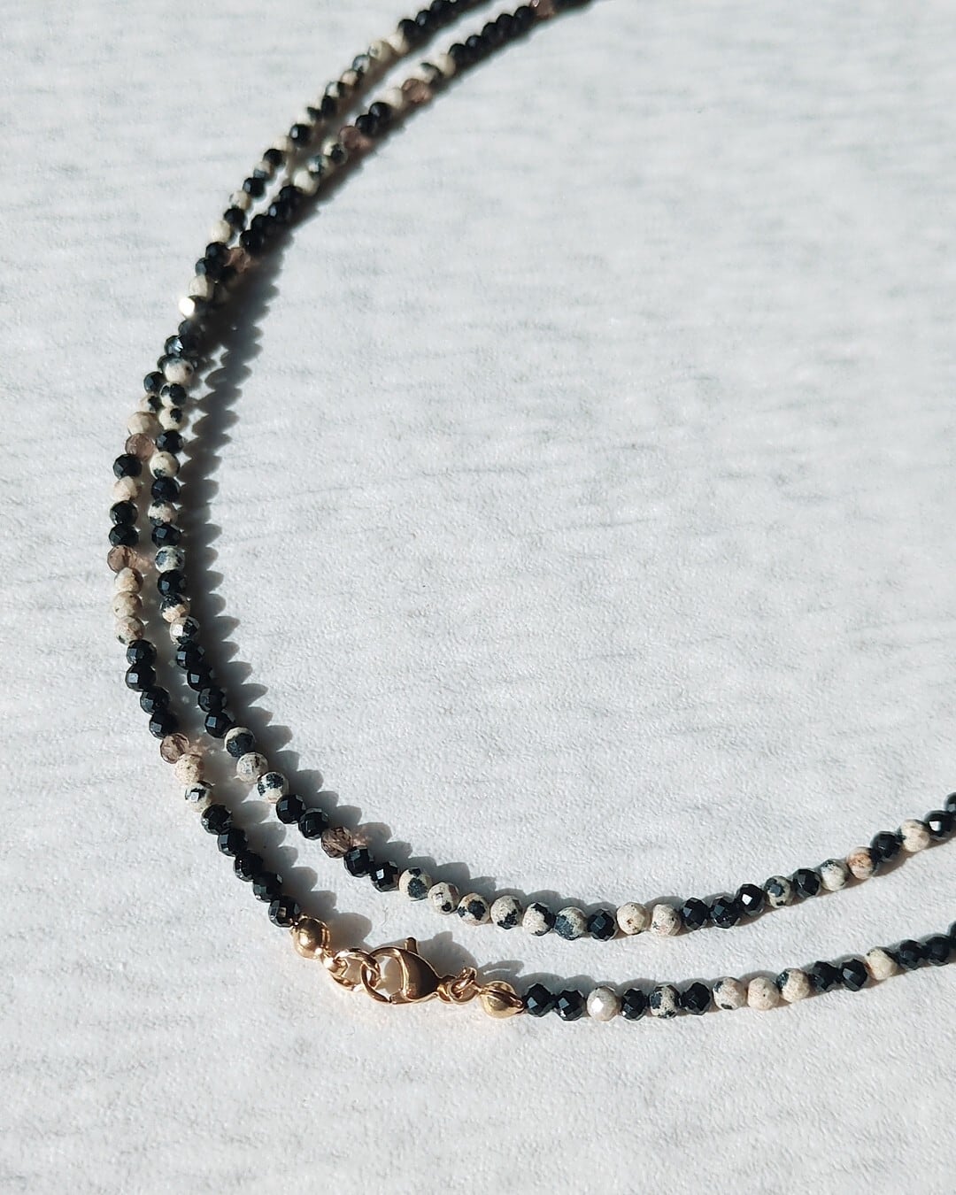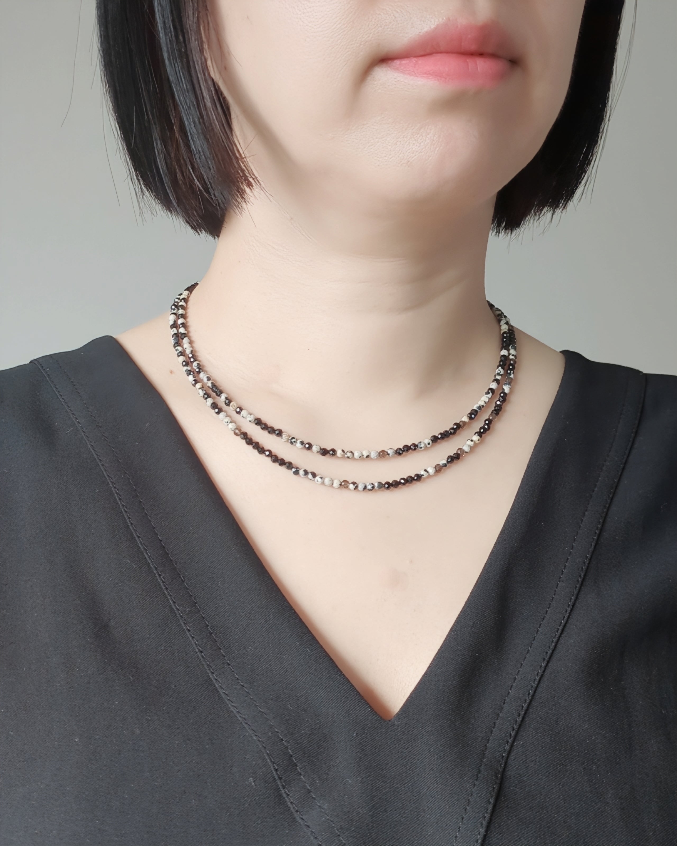 黒い輝きが光を受けて美しく反射するブラックスピネルは、その存在感で首元を華やかに演出し、ダルメシアンジャスパーのユニークな模様が周囲の視線を引きつけること間違いなしです。スモーキークォーツの柔らかな色合いが全体を引き締め、洗練された印象を与えます。