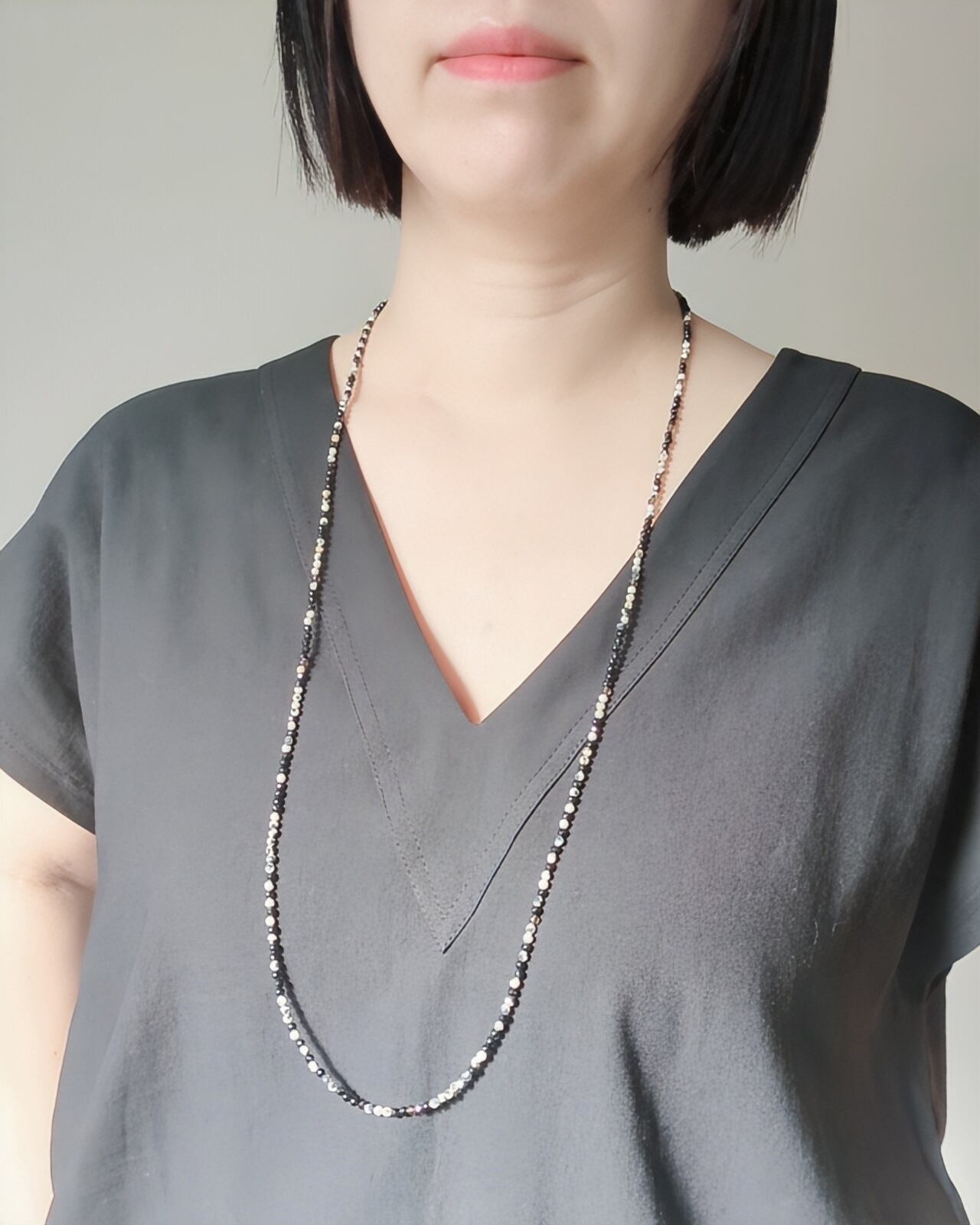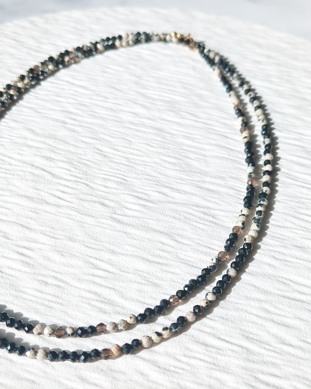 この魅力的なロングネックレスは、天然ブラックスピネル、個性的な模様を持つダルメシアンジャスパー、そして品のある透け感をもつスモーキークォーツの3種類の天然石を使用しています。