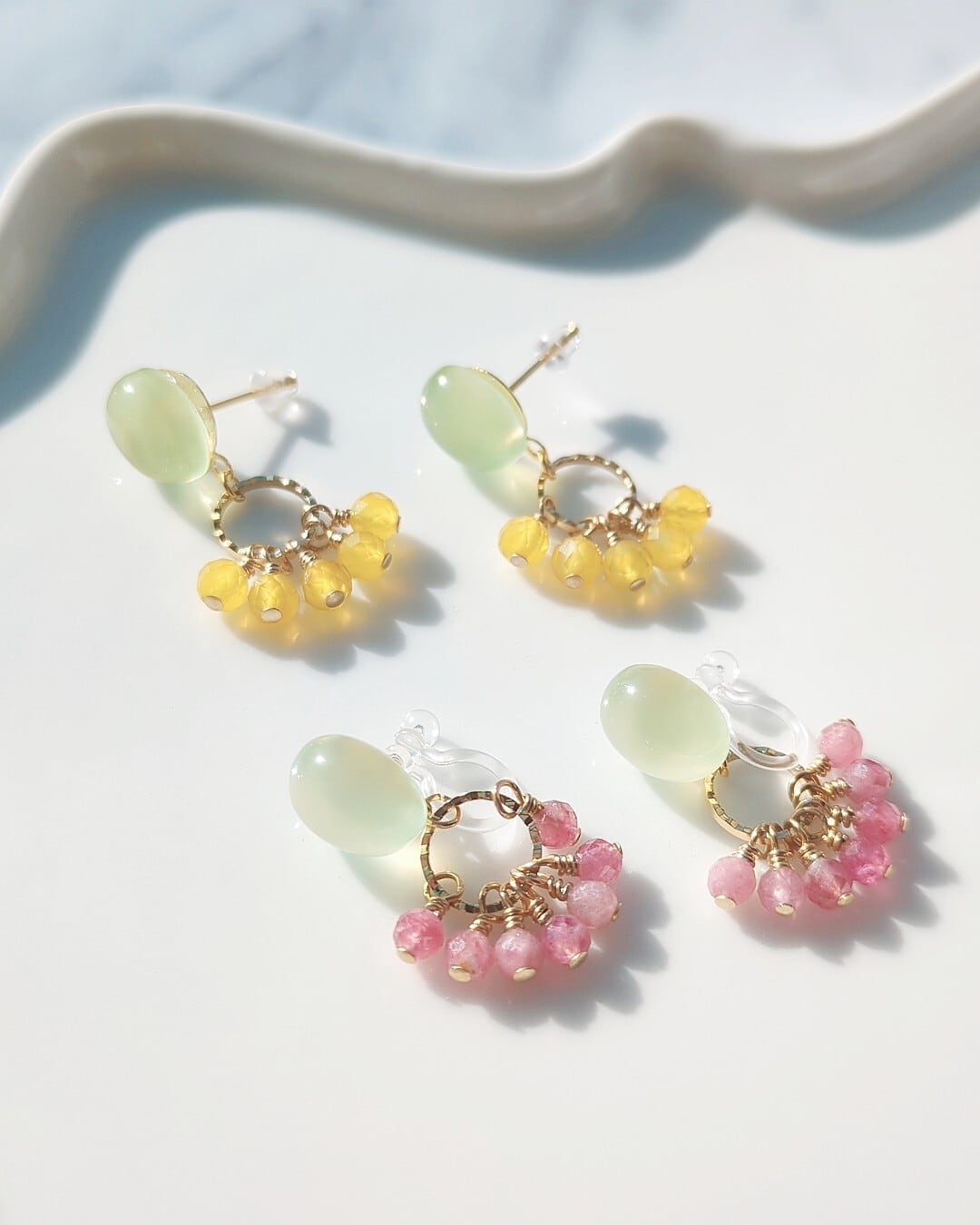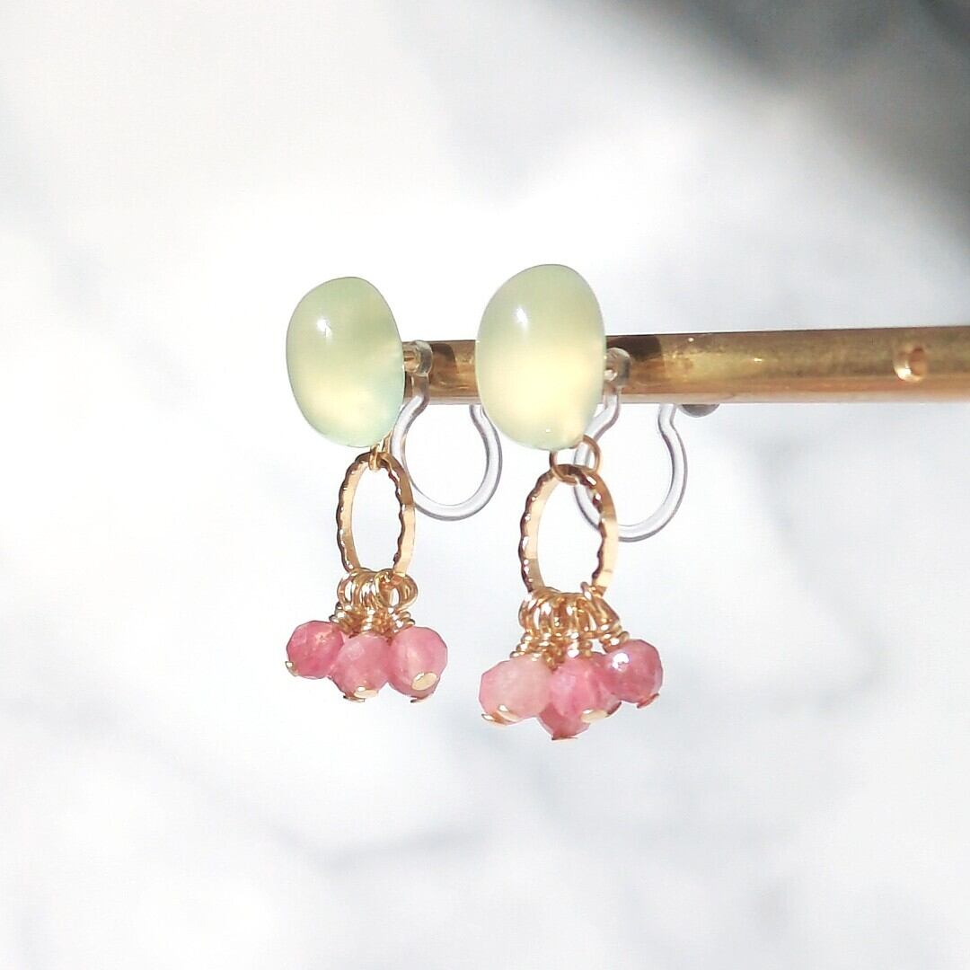 インド産ライムグリーンカルセドニー×イエローカラー カルセドニー/ピンクトルマリンのイヤリングorピアス