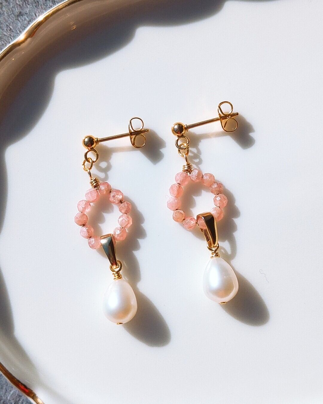 この耳飾りは、インカローズのサークルと淡水パールの絶妙な組み合わせによって、耳元を華やかに彩ります。