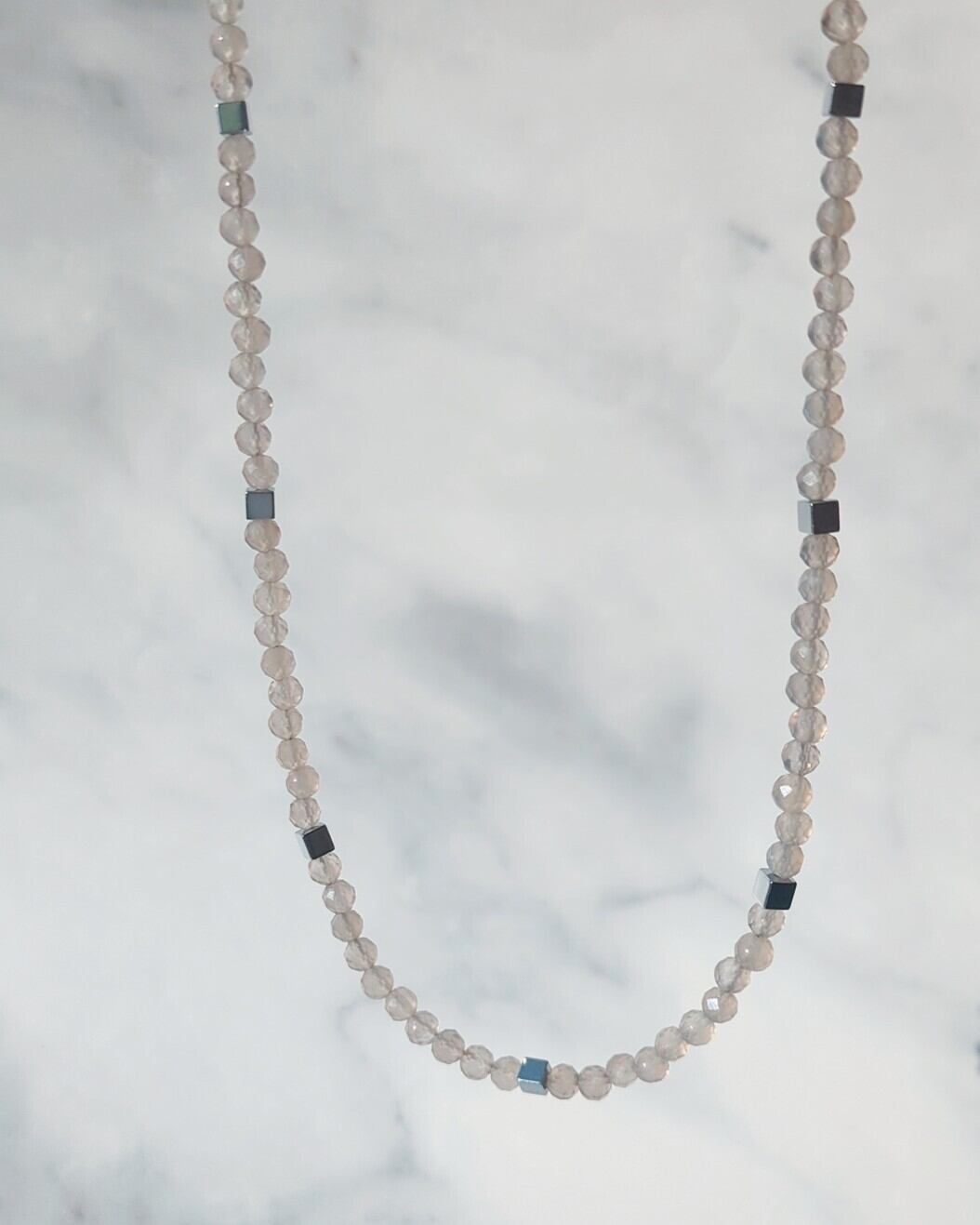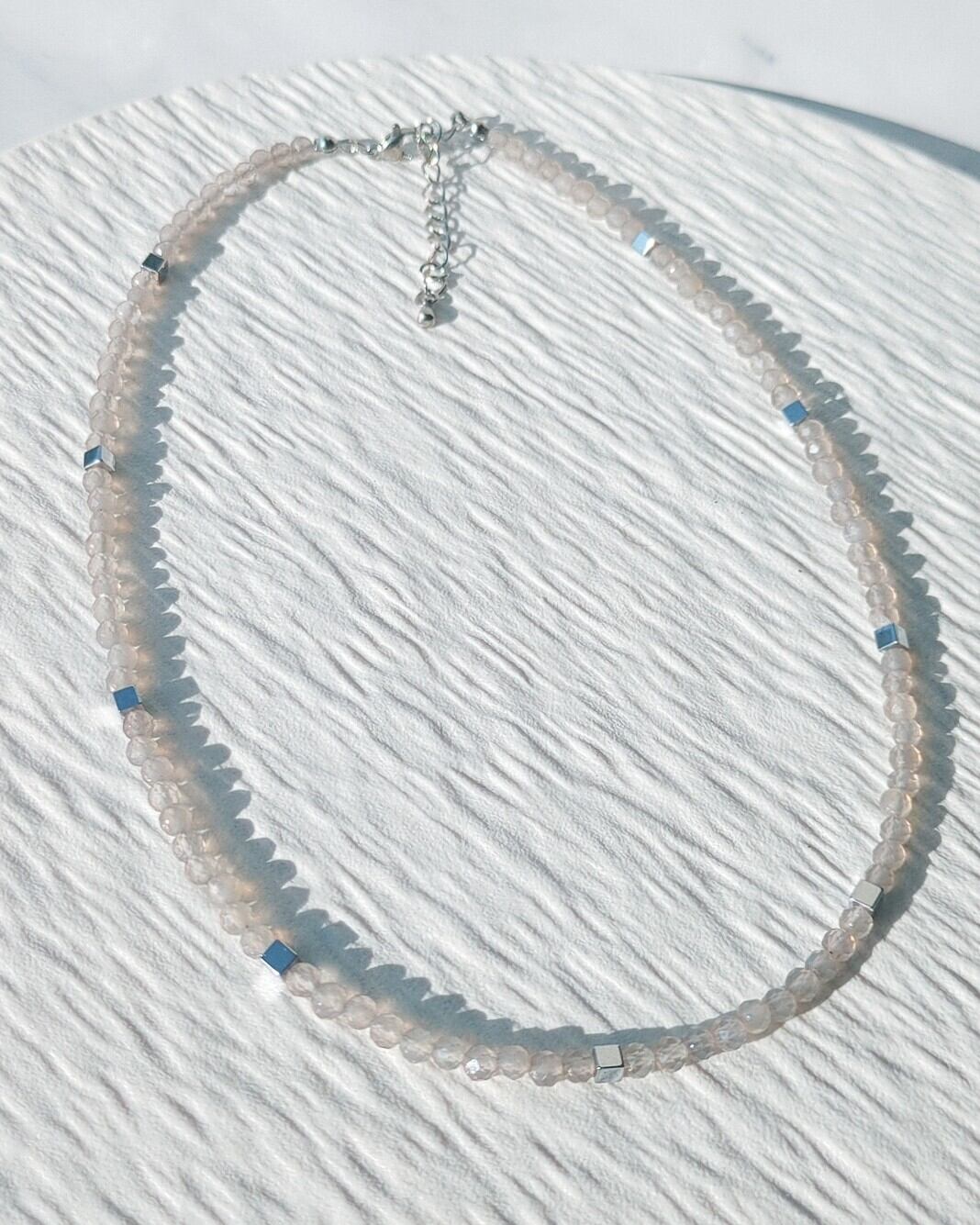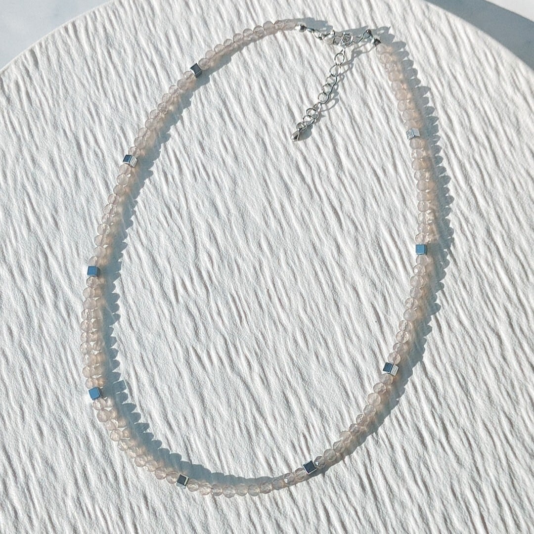 このネックレスは、優しい大人くすみカラーが魅力的なグレーオニキス ラウンドカットをメインに、キューブ型のヘマタイト シルバーコーティングをポイント使いした洗練されたアイテムです。