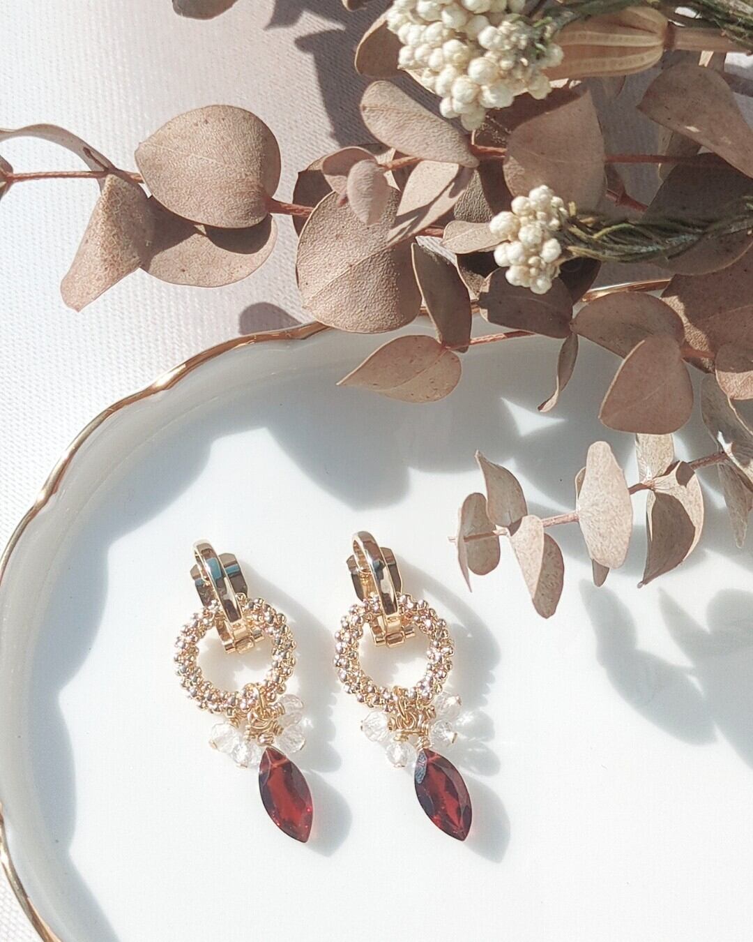 宝石質モザンビーク産ガーネット マーキスファセットカットの深みのある赤色が美しく耳元を彩ります。つぶつぶとした表面感のグレインメタルリングのゴールド色と赤色の組合せが華やかで、パーティシーンにもぴったりなデザインの耳飾りです。