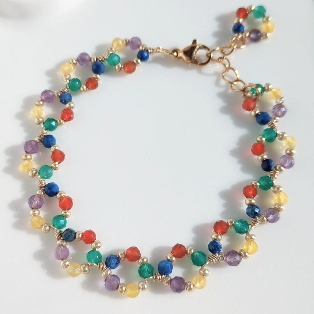 3mmの小粒天然石を贅沢に使用し、ゴールドビーズと組み合わせて直径約1cmほどのサークルを作り出しました。カラフルで可愛らしいこのブレスレットは、手元を美しく彩り、ファッションにアクセントを加えるアイテムです。