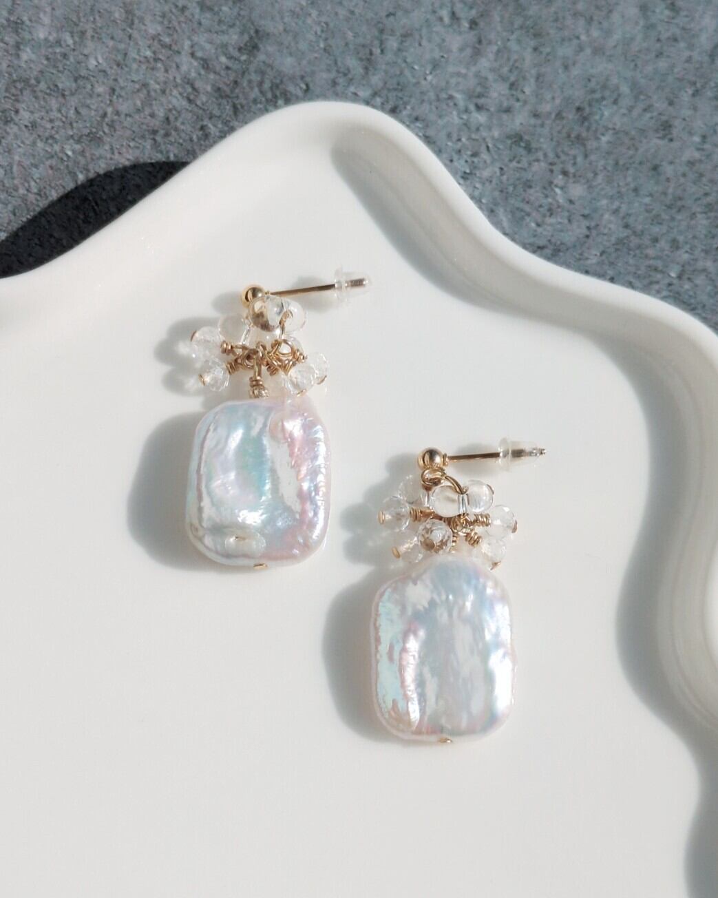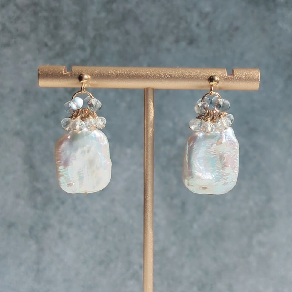 この耳飾りは、天然バロックケシパールのスクエアをメインに使用し、クリスタル クォーツとクリアビーズを組み合わせることで、艶やかさとキラめきを存分に演出しています。