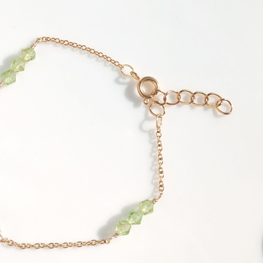 8月の誕生石として知られるペリドットのソロバンカットを3粒ずつ、3箇所に配置し、サージカルステンレス製チェーンで繋げたシンプルで上品なデザインです。このブレスレットがあなたの手元に華やかさを添え、心がときめく瞬間を演出します♡