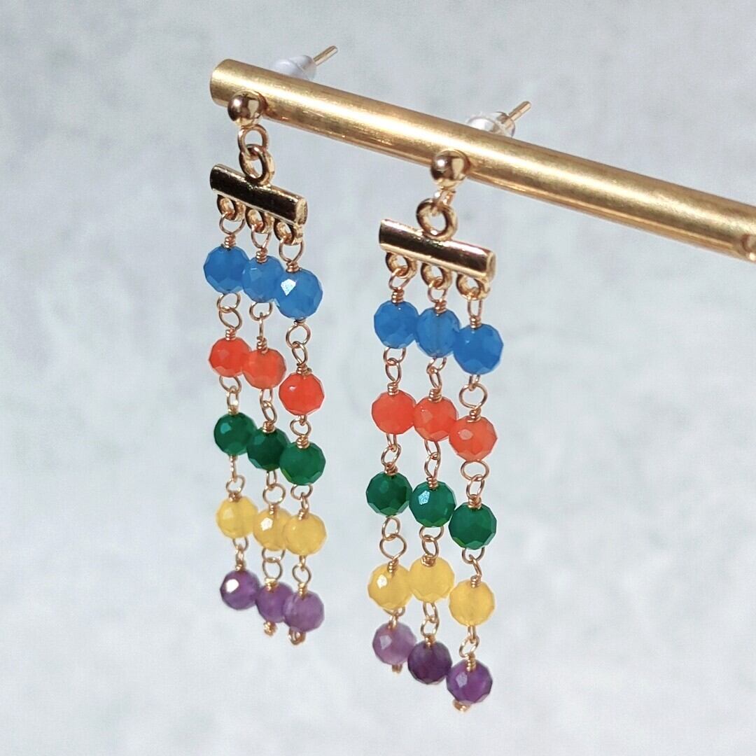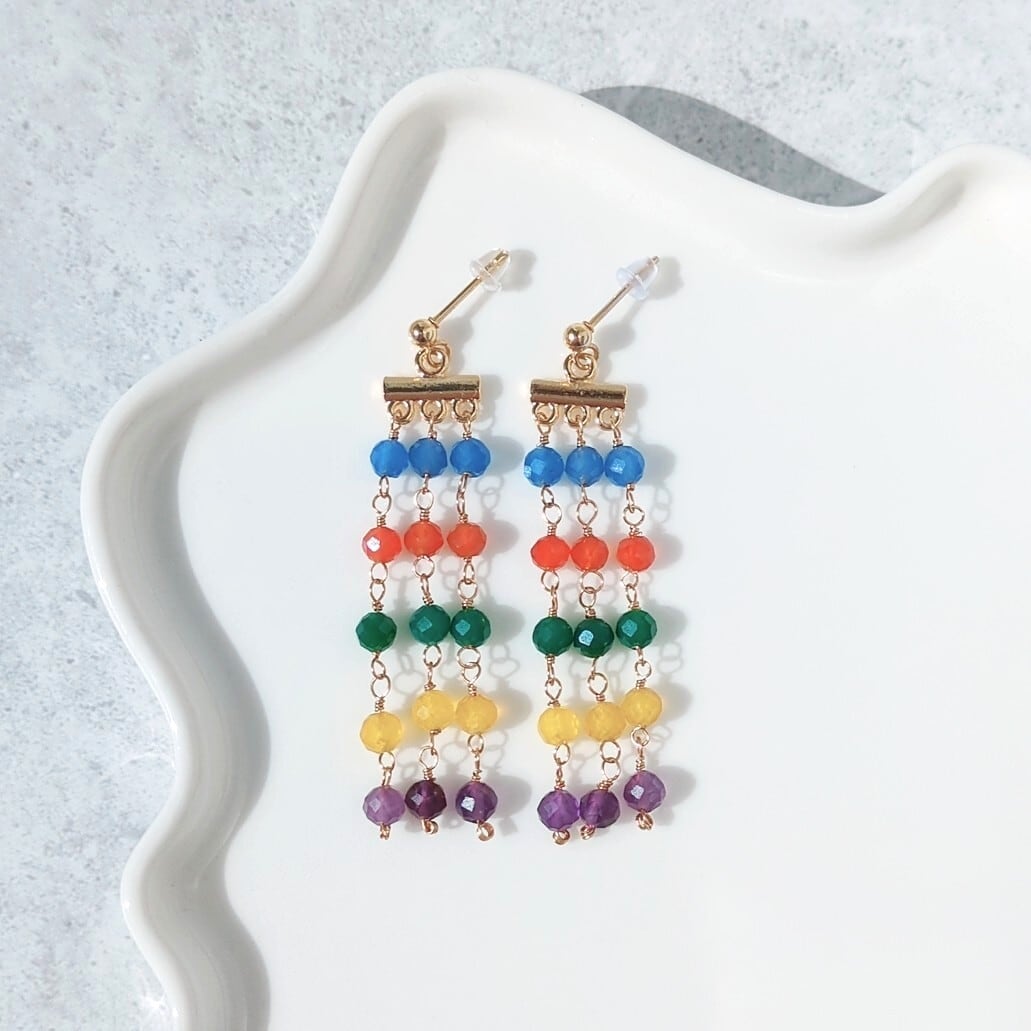 鮮やかな青、赤、緑、黄色、紫の5色からなる天然石のラウンドカットを使用した、シャラシャラと揺れる魅力的なデザインの耳飾りです。ワイヤーで繋がれた5色の天然石が、一線の美しさと華やかさを演出します♡