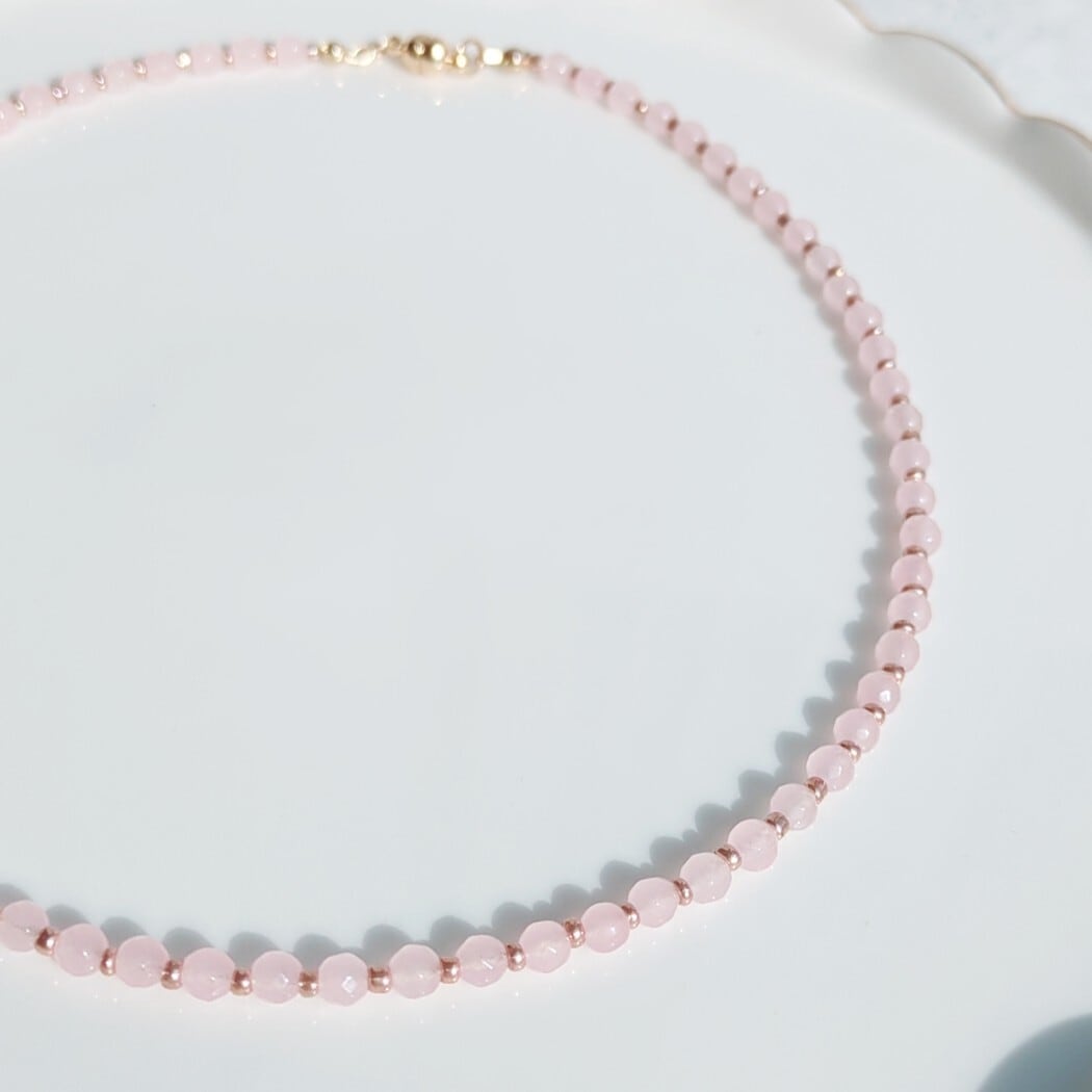 優雅で洗練されたデザインのライトピンクジェードとピンクゴールドカラーのシードビーズを交互に使用した、美しい一連ネックレスです。
