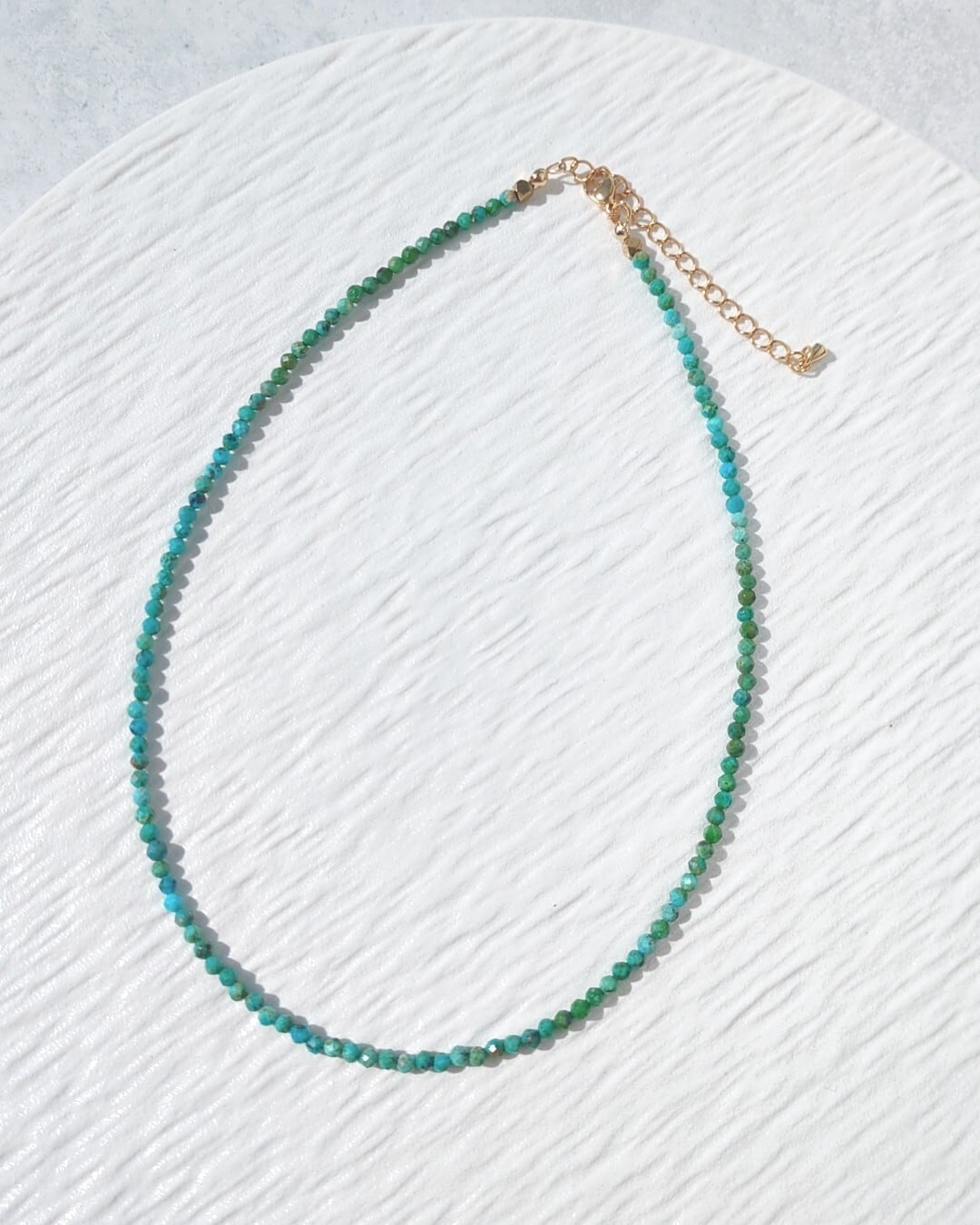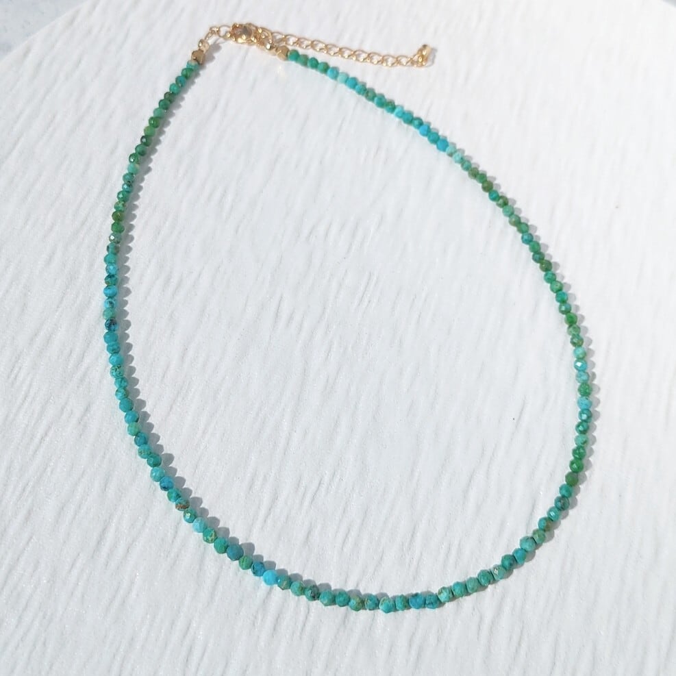 美しい原石由来の模様が印象的な小粒のターコイズを贅沢に使用した一連ネックレスです。3mmのラウンドカットターコイズが、洗練された雰囲気を演出しています。そして、留め具の隣には、ヘマタイトのキューブカットをポイントとして使用し、シンプルながらも魅力的なデザインに仕上げました♡