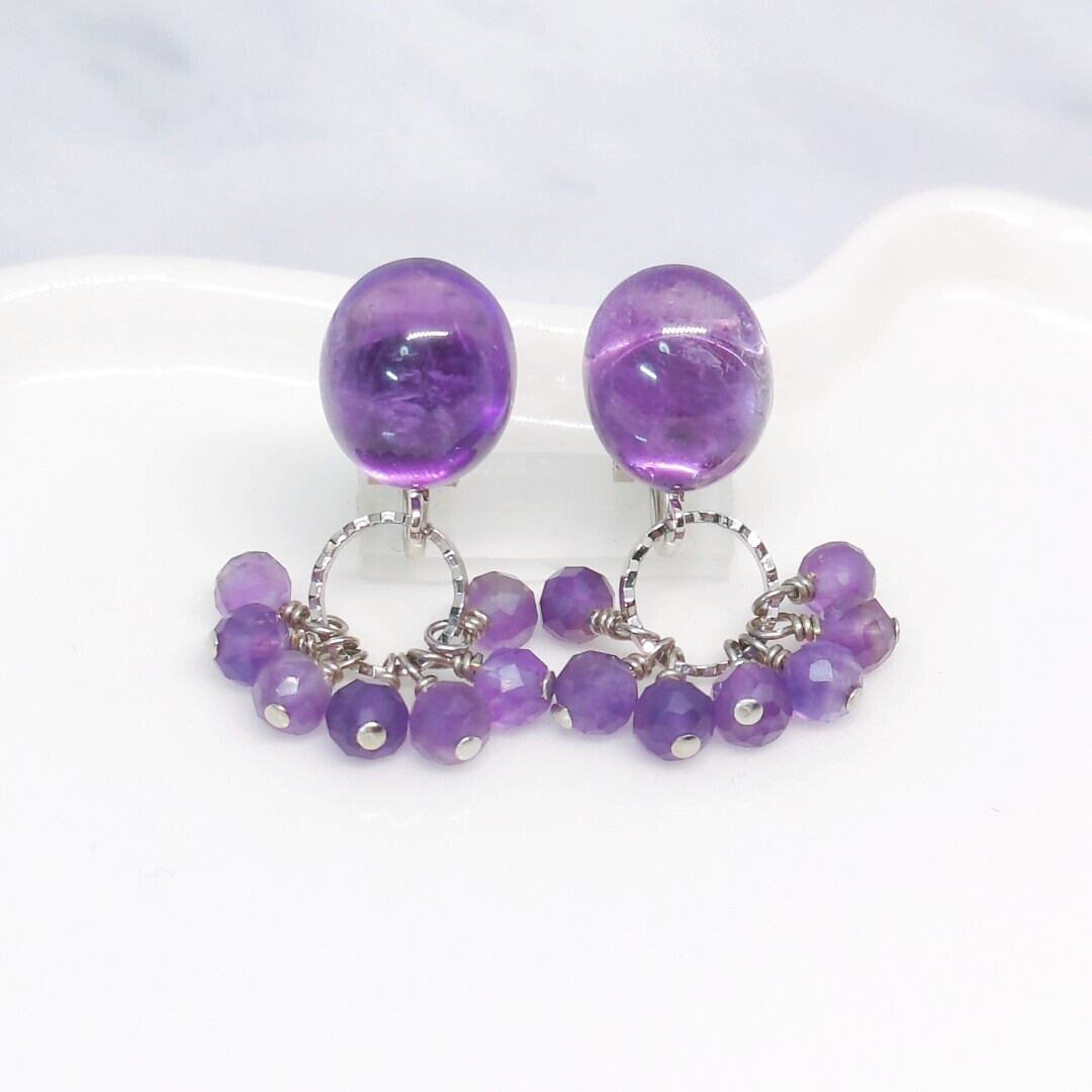 鮮やかな紫色のザンビア産アメジストオーバルカボションに、ラウンドカットのアメジストを片耳に7粒ずつ組み合わせた、華やかで上品な耳飾りです。視線を集める魅力的なデザインが、あなたのスタイルに彩りを加えます。
