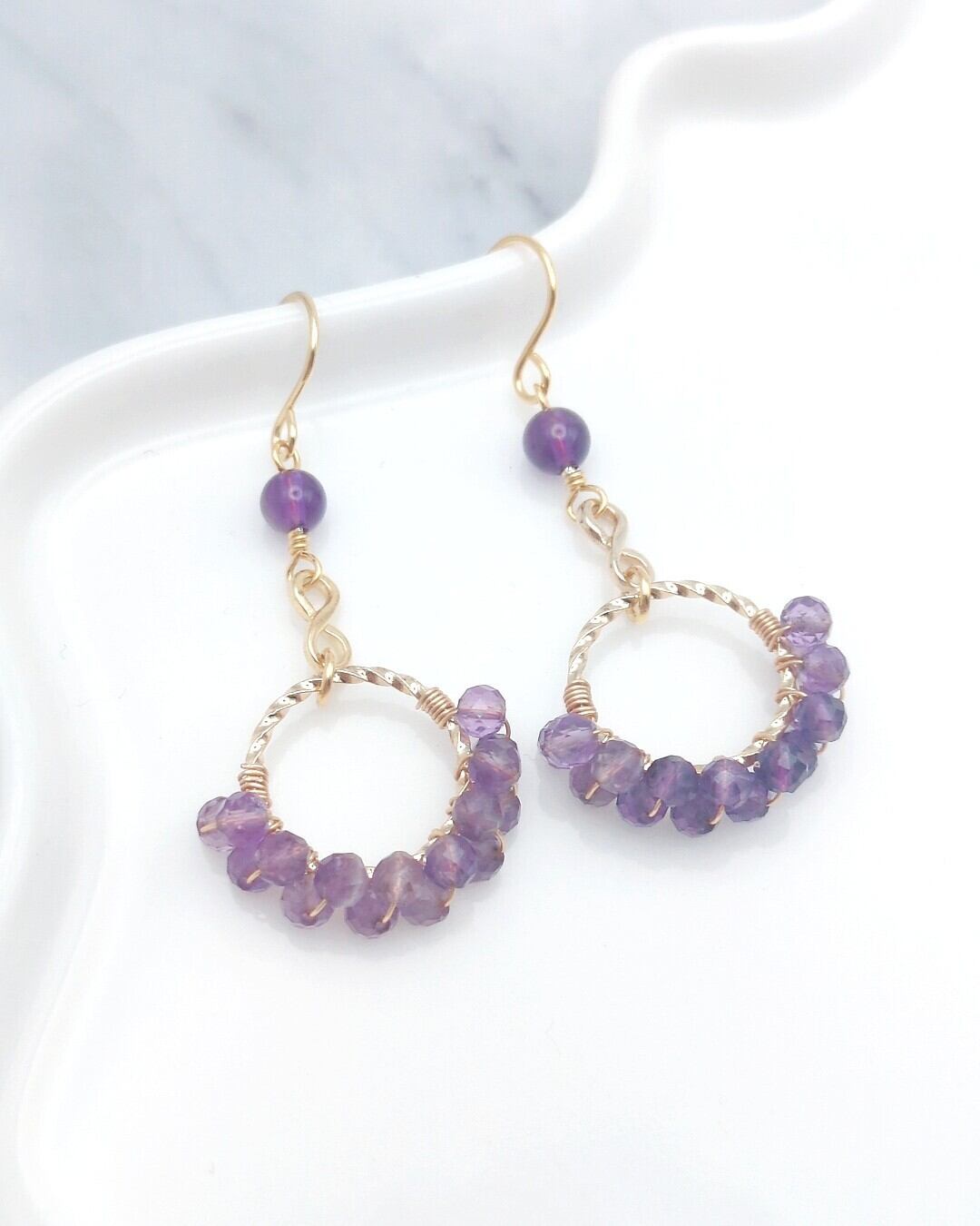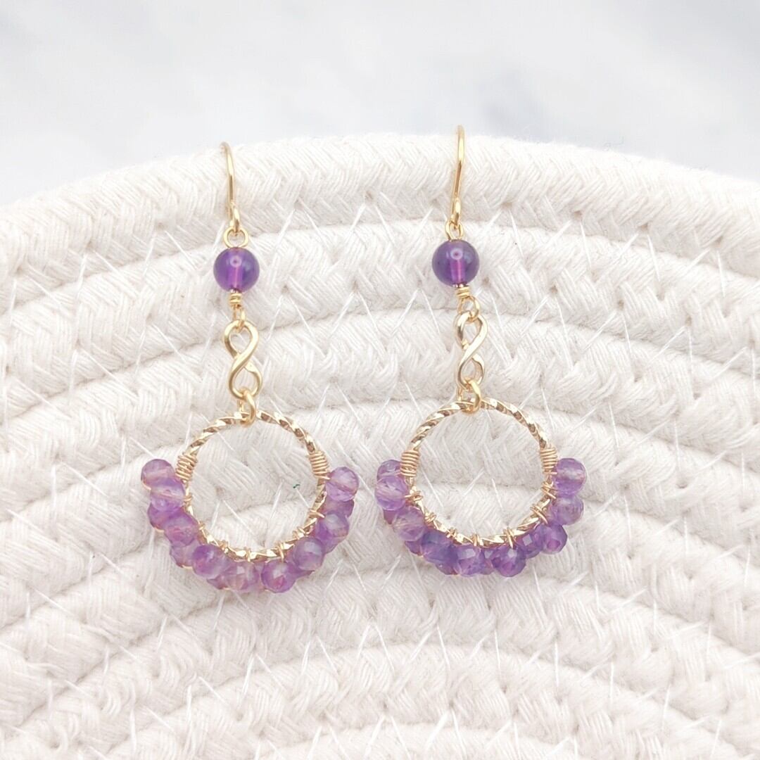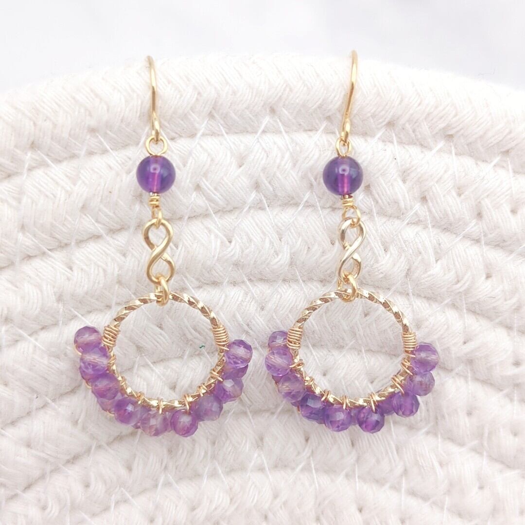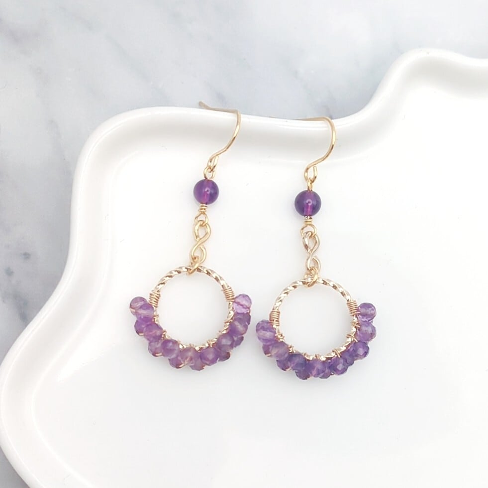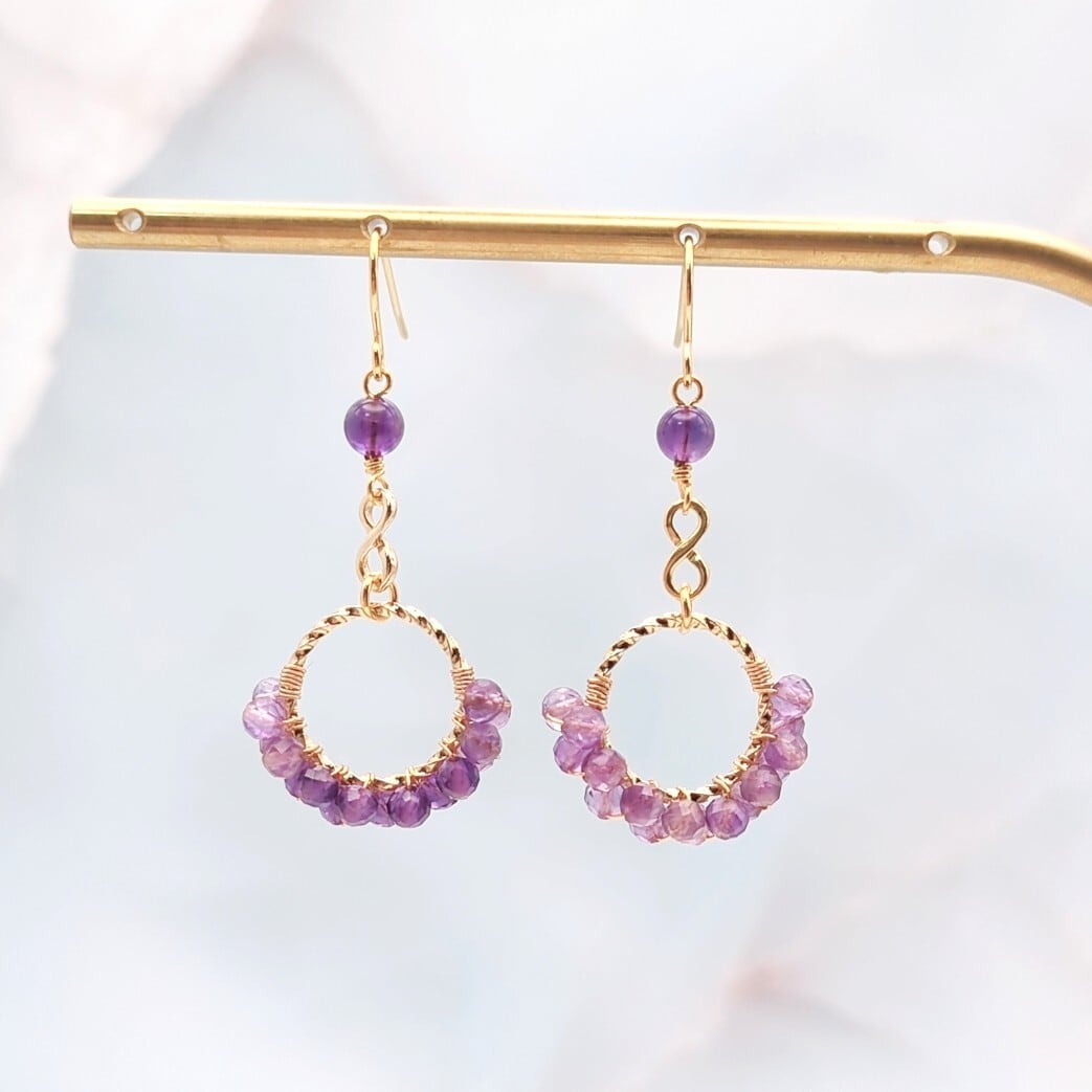 ラウンドカットのアメジストと小粒のラウンドカットをツイストフープに巻き付け、インフィニティチャームで繋いだデザインが特徴です。